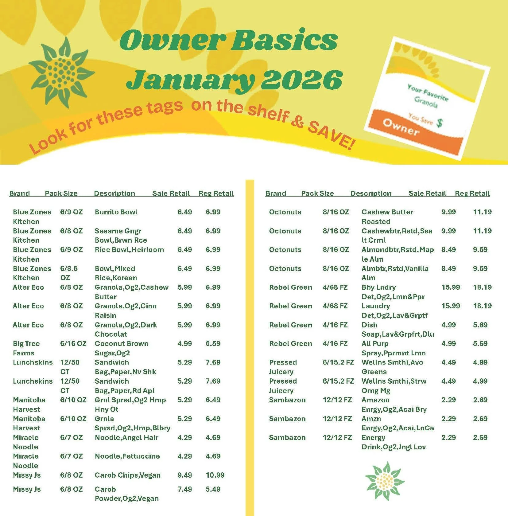 At our co-op, Owner Basics and weekly sale items are two great ways to save on items you need and want. Owner Basics help you save on items most households use while the weekly sale items let you take advantage of seasonal, most popular, and featured items.